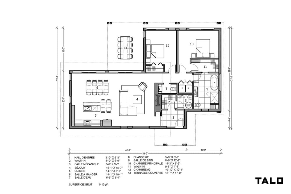 Its layout, designed to maximize shared living areas, provides a thoughtful separation to ensure bedroom privacy. the main living space extends lengthwise and flows outdoors onto a partially covered terrace.