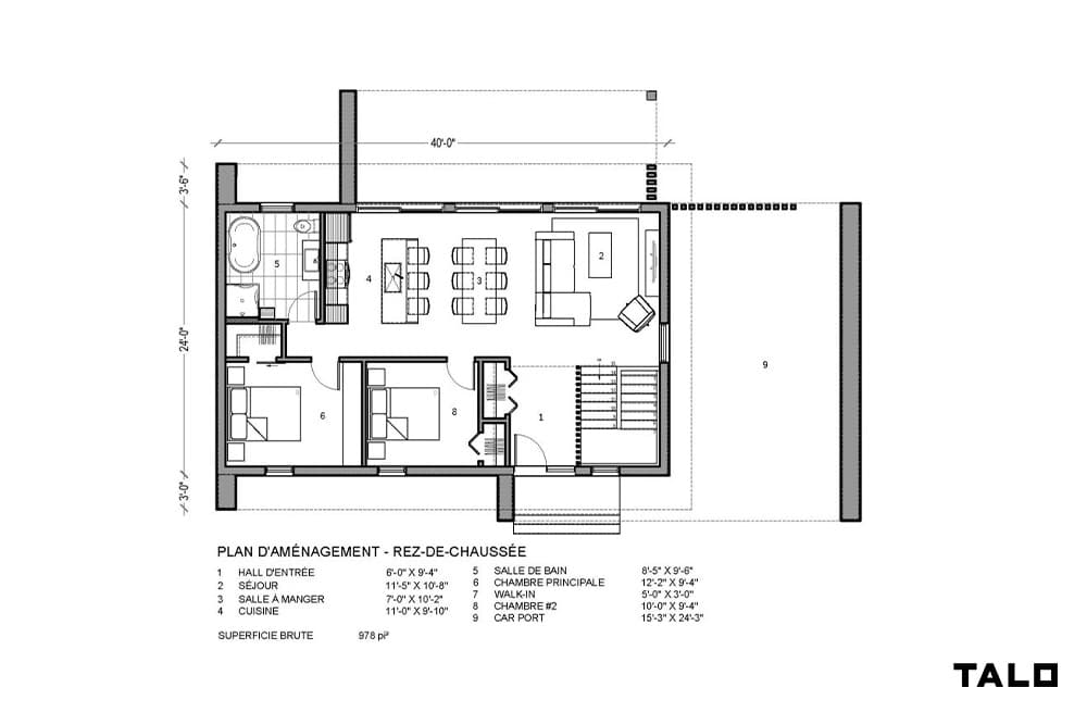 This nordic-inspired single-storey residence features a cathedral ceiling, where the main living spaces flow seamlessly and open onto abundant glazing overlooking the yard. the spacious and functional entryway is separated from the staircase by an elegant wooden slat screen, allowing for maximum natural light throughout.