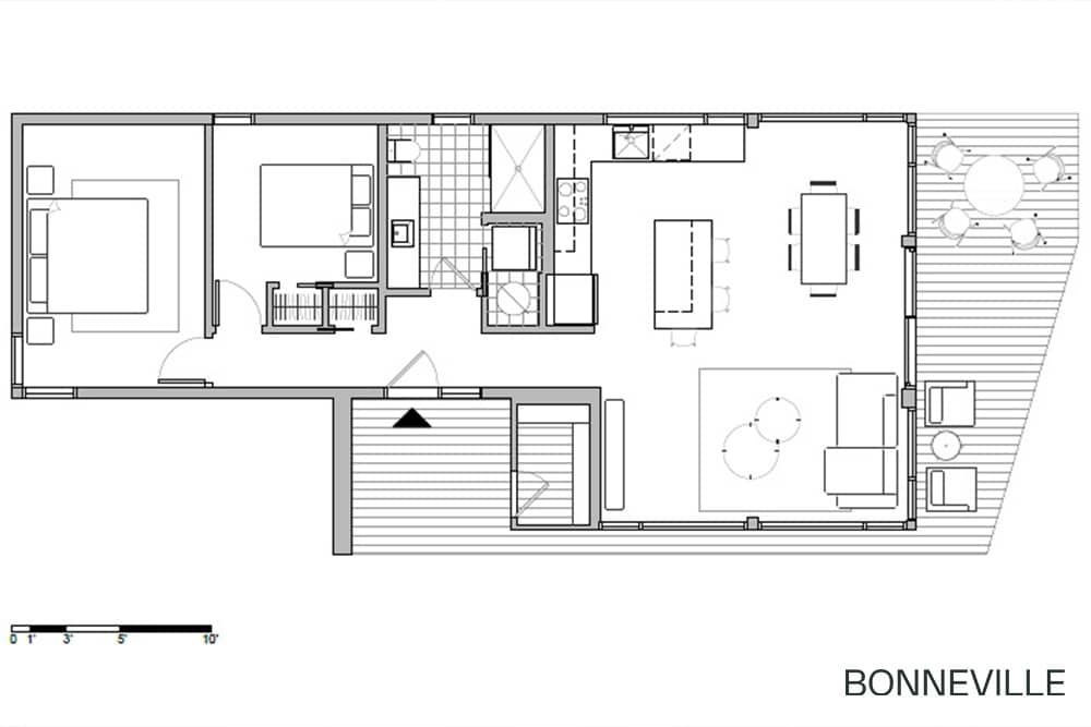 L’espace intérieur à aire ouverte rassemble cuisine, salle à manger et salon dans un environnement lumineux et convivial. Avec deux chambres confortables et un accès direct à la terrasse, ce modèle offre un équilibre idéal entre simplicité, modernité et bien-être en nature.