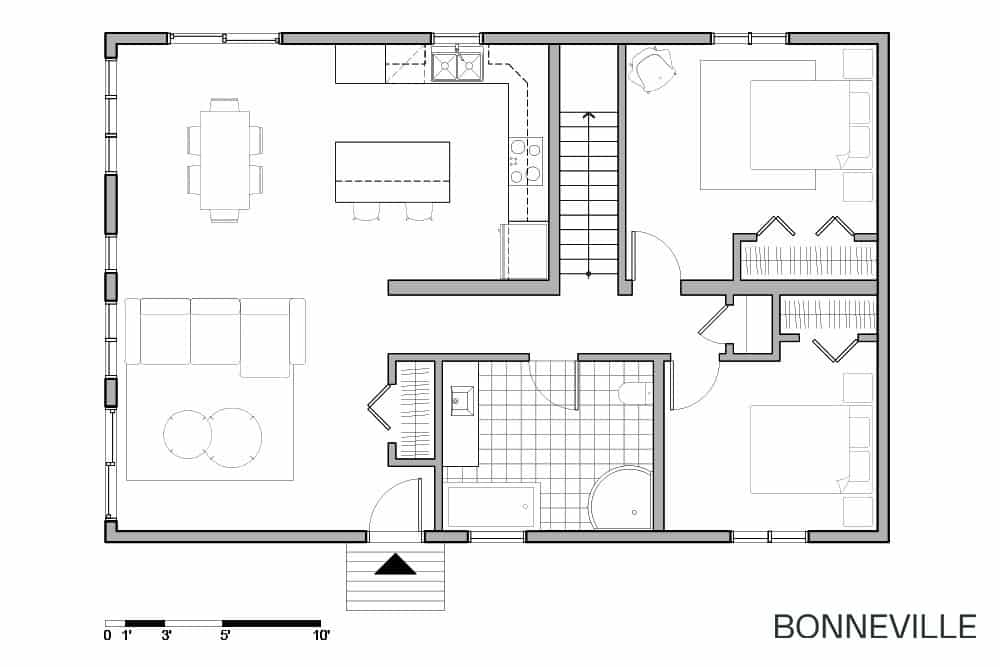 Ce modèle allie simplicité moderne et charme chaleureux, avec une architecture épurée et une allure naturelle qui se fond parfaitement dans son environnement. Son vaste espace de vie à aire ouverte, baigné de lumière grâce à une généreuse fenestration, crée une ambiance conviviale idéale pour se retrouver en famille ou entre amis.